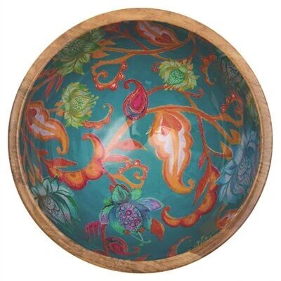 Op zoek naar een stijlvolle schaal om (zomerse) salades of andere gerechten te serveren? Dit exemplaar van By Room is er één voor op uw wensenlijst! Het item is vervaardigd uit mangohout en heeft een rond design met een diameter van 25 cm. De binnenkant is voorzien van een sticker met turquoise/oranje kleuren voor een speels effect. Combineer de schaal met het bijpassende slacouvert voor een elegant geheel.
