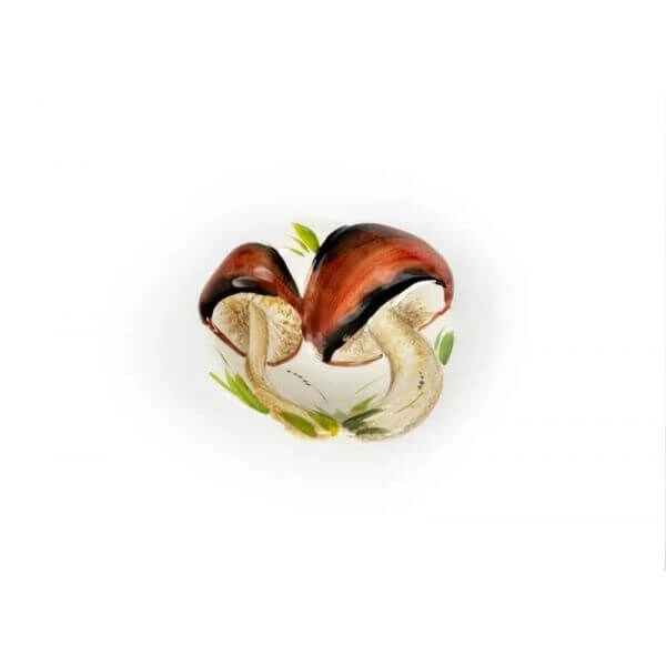 De ronde Oldenhof schaal is gemaakt van wit aardewerk en is gedecoreerd met paddenstoelen. De diameter van de schaal is 15 cm. Gebruik de persenteerschaal voor de presentatie van herfstige gerechten.