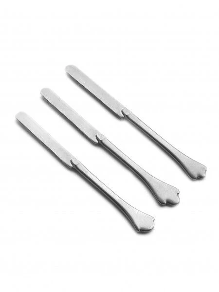 De Serax Merci Mix 4-5-6 tafelmessen zijn gemaakt van roestvrij staal dat een stonewash-behandeling heeft gehad. Elk van de drie delen heeft een ander einde van de handgreep. Dek het mes in voor het hoofdgerecht.